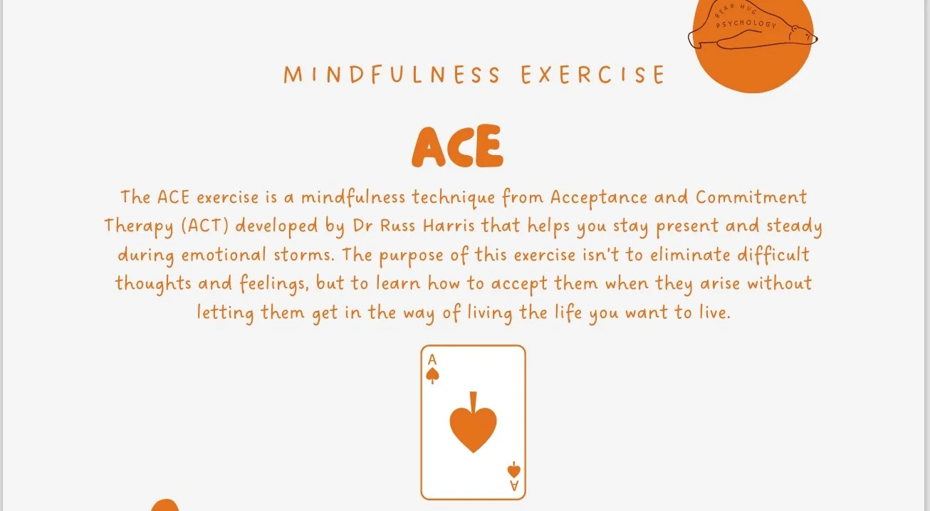 The ‘ACE’ exercise is a simple mindfulness exercise based on Acceptance & Commitment Therapy (ACT).